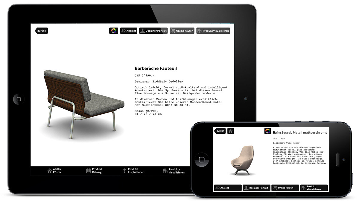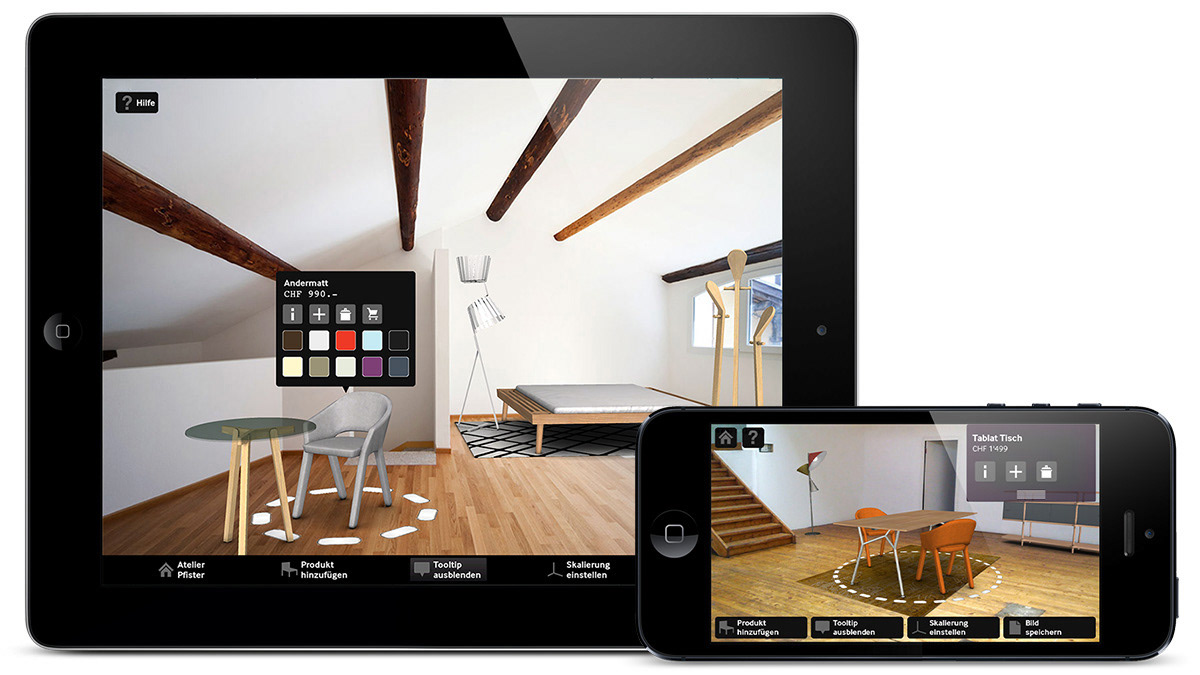 The mobile app allows through augmented reality to place Atelier Pfister's design furniture collection in to your own photos made with your smartphone or tablet.